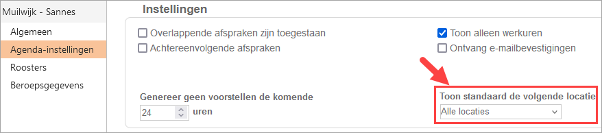 Wanneer je een nieuwe locatie toegevoegd hebt, dan staat deze misschien niet gelijk in je agenda geselecteerd. Dit kun je instellen bij Praktijk > Medewerkers > Open je eigen account > agenda-instellingen. Zorg dat de instelling ‘Toon standaard de volgende locatie‘ dan op ‘Alle locaties‘ staat als je meerdere locaties hebt: