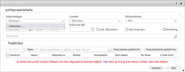 Mocht je bij het maken van een afspraak in de dropdown 'Afspraaktype' geen optie krijgen, dan komt dit omdat geen enkele medewerker een actief rooster (meer) heeft. Er moet minimaal 1 behandelaar een actief rooster hebben om een afspraaktype te kunnen selecteren bij het maken van een afspraak.