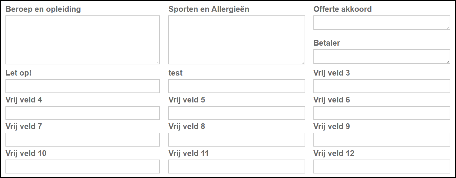 Vrij veld 1 t/m Vrij veld 12: Deze velden zijn volledig vrij in te vullen en kunnen door de praktijk zelf worden ingericht. Via Praktijk > Voorkeuren > Patiëntnotities - instellingen kun je: