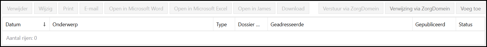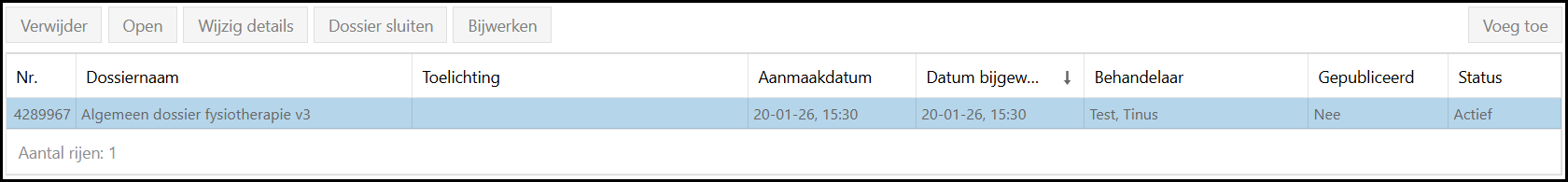 - [Verwijder]: Verwijdert het geselecteerde dossier. Vereist bevestiging.
