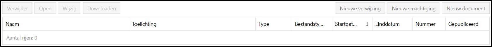 Hier vind je documenten die aan de patiëntenkaart zijn toegevoegd, zoals verwijzingen, machtigingen en overige bestanden. Met [Nieuwe verwijzing] of [Nieuwe machtiging] voeg je een verwijzing of machtiging toe. Voor andere bestanden gebruik je [Nieuw document].