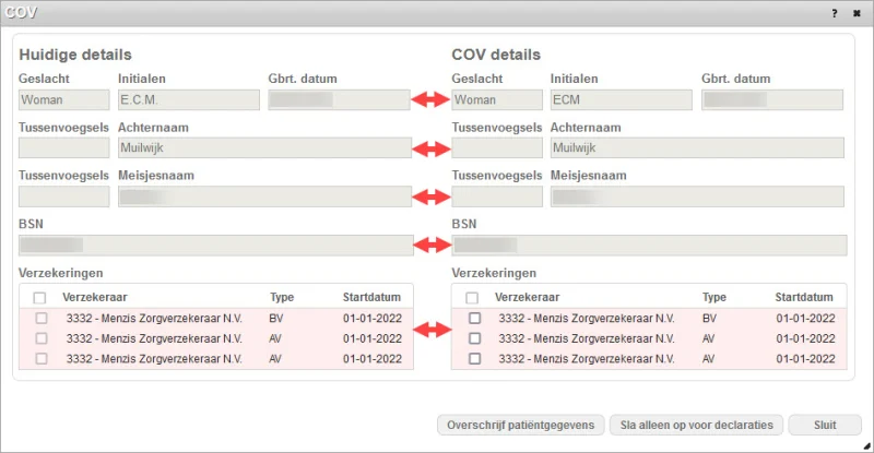 Het verzekerdennummer dient (als logische sleutel) in onderliggende detailrecords hetzelfde te zijn. Controleer of de informatie die opgehaald wordt bij de COV ook daadwerkelijk van deze patiënt is. Wanneer de verkeerde informatie opgehaald wordt, vul dan in de patiëntenkaart het BSN in en voer de COV opnieuw uit. Dan moet de juiste informatie naar voren komen. Sla de patiëntenkaart op en sla het consult opnieuw op. Daarna kun je de consulten weer indienen.