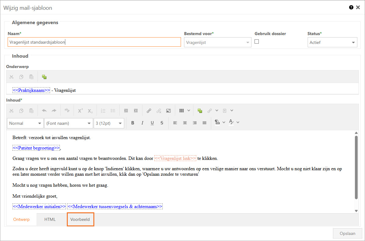 - Ga naar Praktijk > Tekstsjablonen en open het gewenste e-mailsjabloon.
