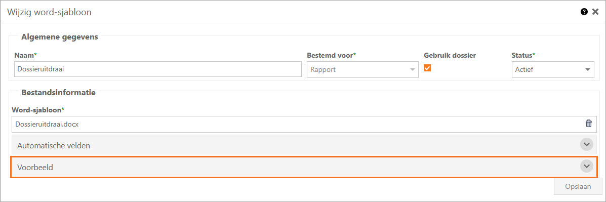 - Onderaan vind je de optie ‘Voorbeeld’. Klik op [Samenvoegen], hier kun je een patiënt zoeken om te controleren of de juiste informatie wordt weergegeven. Sluit af met kruisje of Opslaan.
