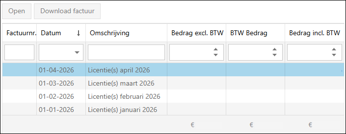 Op deze pagina vind je alle informatie over de facturen die je van James ontvangt voor het gebruik van de software. Je kunt hier je factuurgegevens controleren, zien hoe je factuur is opgebouwd en zowel eerdere als aankomende facturen bekijken. Ook krijg je inzicht in de kosten per licentie en eventuele aanvullende diensten.