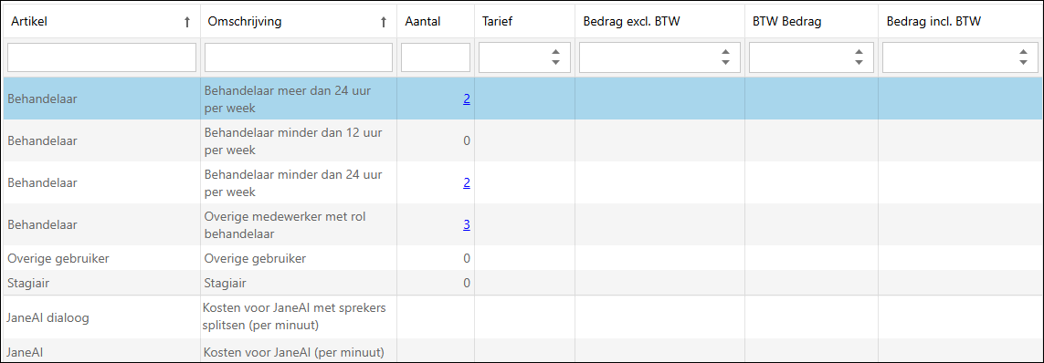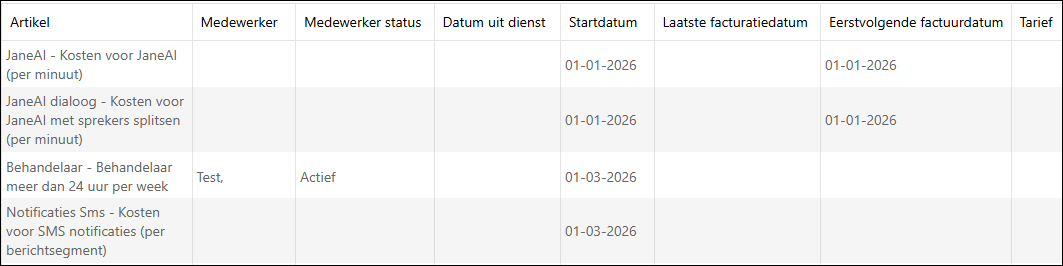 Hier zie je hoe je factuur is opgebouwd. De kosten zijn gebaseerd op het aantal actieve medewerkers en hun rol. Per type medewerker geldt een artikel met bijbehorend tarief. Het totaalbedrag wordt berekend inclusief en exclusief btw.