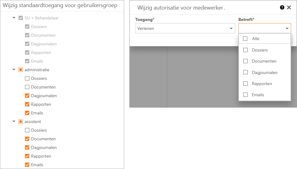 Let op: Deze rechten overschrijven de instellingen die mogelijk handmatig per dossier, rapport of document zijn ingesteld.