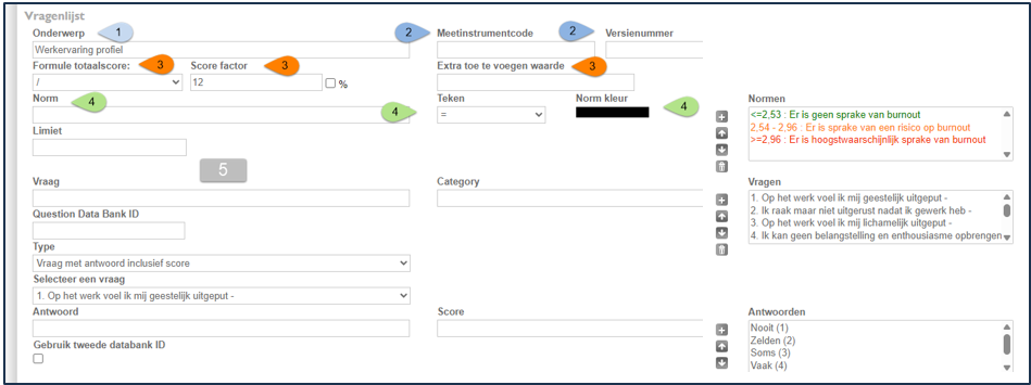 De totaalscore van de vragenlijst is vervolgens de som van alle sub scores rekening houdend met de Formule totaalscore en de scorefactor. -