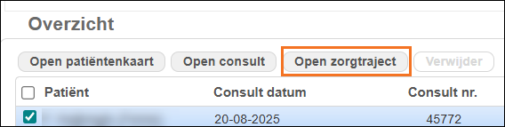 - Open het zorgtraject van de patiënt in de declaratie met de knop [Open zorgtraject] of via de Patiëntenkaart > 'Zorgtrajecten'