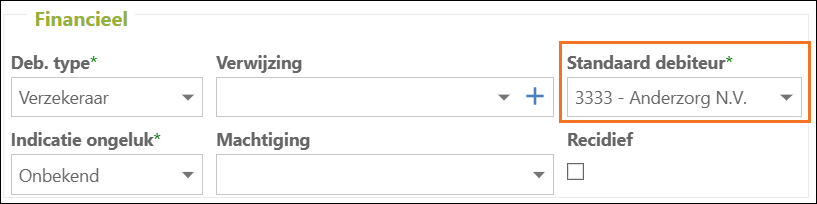 - Selecteer onder 'Financieel' in het veld 'Standaard debiteur' de juiste verzekeraar die overeenkomt met de verzekeraar op de declaratie