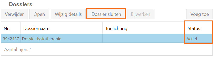 Het behandeldossier sluit je in de patiëntenkaart af in het dossier overzicht. Selecteer het dossier en klik op [Dossier sluiten] In de tabel zie je dat de status aangepast is.