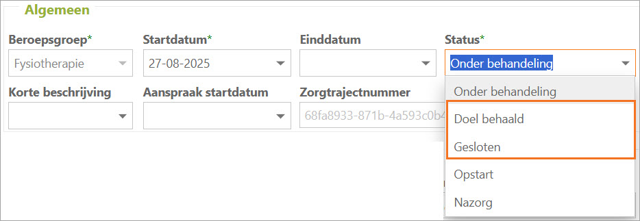 Voor professies zonder het 'reden einde zorg' veld in het consult navigeer je naar het zorgtraject zelf en vul je een afsluitende status in.