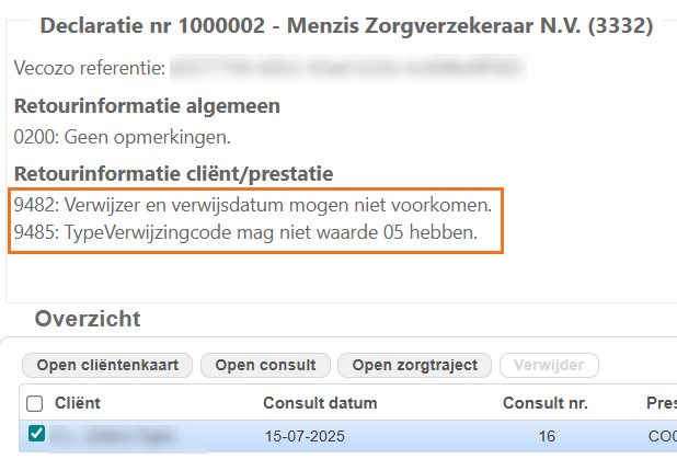 Deze melding geeft aan dat er verwijsinformatie meegestuurd wordt met de declaratie waar dat niet toegestaan is in een ZPM-zorgtraject. Vaak staat deze melding gepaard aan een andere retourcode, bijvoorbeeld 9485: TypeVerwijzingcode mag niet waarde 05 hebben. Ga deze andere melding na en pas de verwijzing of het verwijstype aan in het ZPM-zorgtraject.