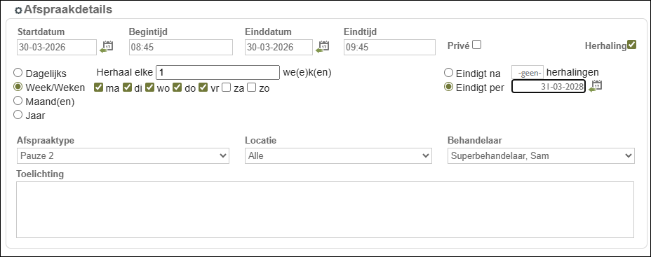 Er is een maximaal van 31 herhalingen of een looptijd van twee jaar in te plannen. - Afspraaktype: Wanneer je afspraaktypes hebt aangemaakt voor algemene afspraken, kun je deze hier selecteren. De duur wordt dan automatisch aangepast.